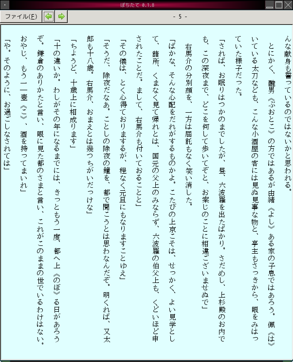 と実行してあげて下さい。あとはメニューバーの[ファイル]の[開く]から、読みたいファイルを選択するだけです。[←]をクリックするか←キーを押すと次ページへ、[→]をクリックするか→キーを押すと前ページへ移動します。[ファイル]の[栞を挟む]をクリックして表示しているページを記憶させると、次回起動時には自動的に栞を挟んだページを表示します。[ファイル]の[終了]をクリックするか qキーまたは ESCキーを押すと『ぽちたて』を終了します。