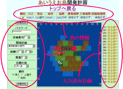 | 資金繰り | なし | 特に開発は行いませんが、100億円を工面することが出来ます。 また、たまに開発進行委員会から、援助金が支給されることもあります。 この計画を行っている間は島を放置しているとみなされます。 |