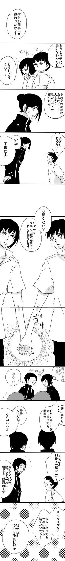 そして東北上越はいつも喧嘩ばっかりしてるけどこんな幸せな一瞬もたまにはあっていいなあと思うのです。上越に困惑させられながらも付き合う東北に愛を感じます。